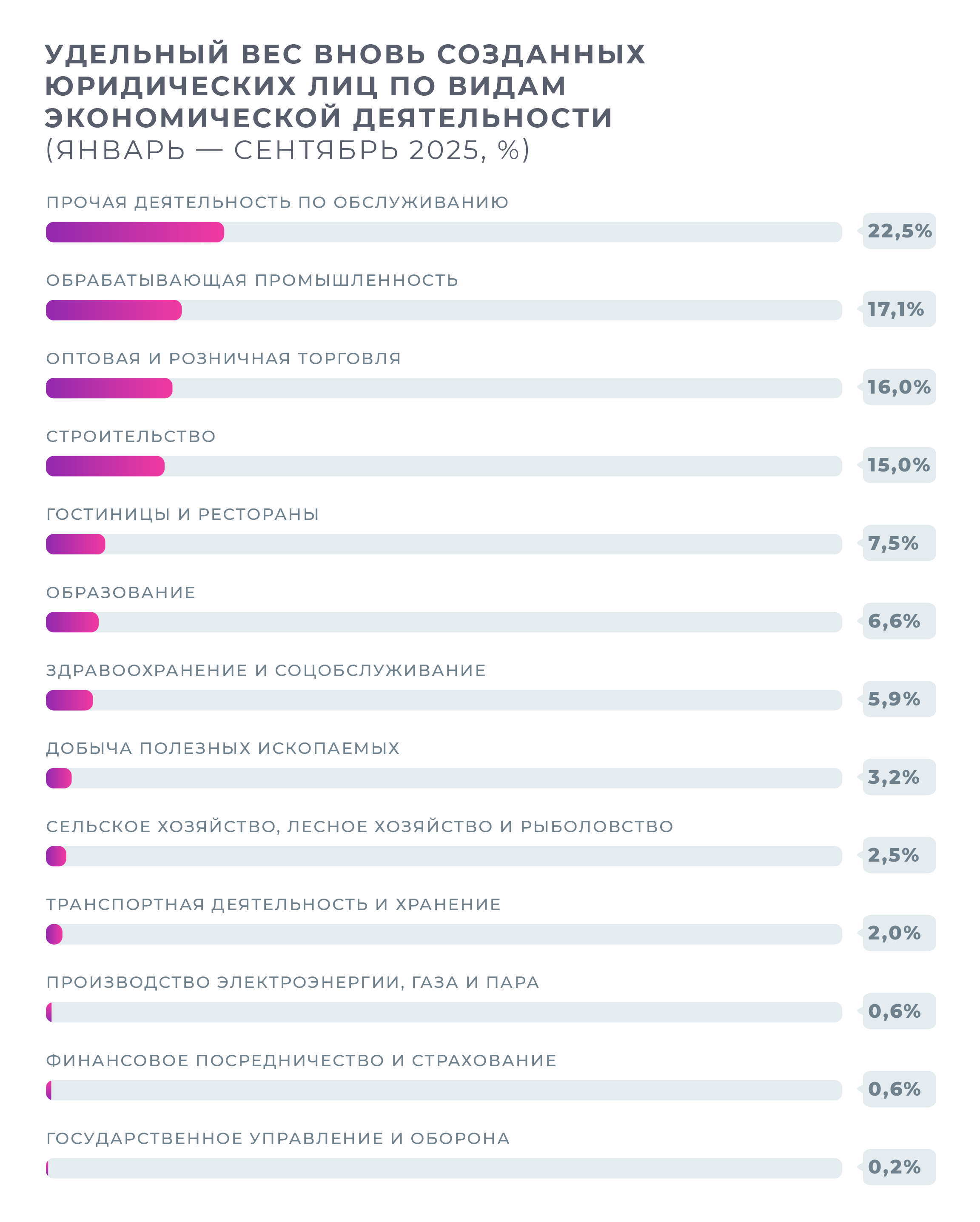 По данным за январь–сентябрь 2025 года среди вновь созданных юридических лиц наибольший удельный вес приходится на обрабатывающую промышленность, оптовую и розничную торговлю, а также строительство.