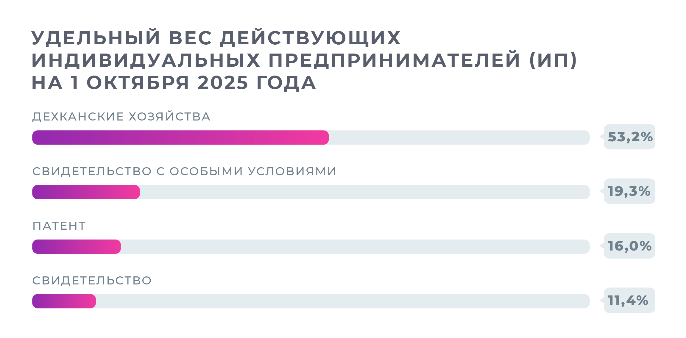 Среди индивидуальных предпринимателей больше половины относятся к декханским хозяйствам, значительная часть работает по свидетельствам с особыми условиями и по патенту.