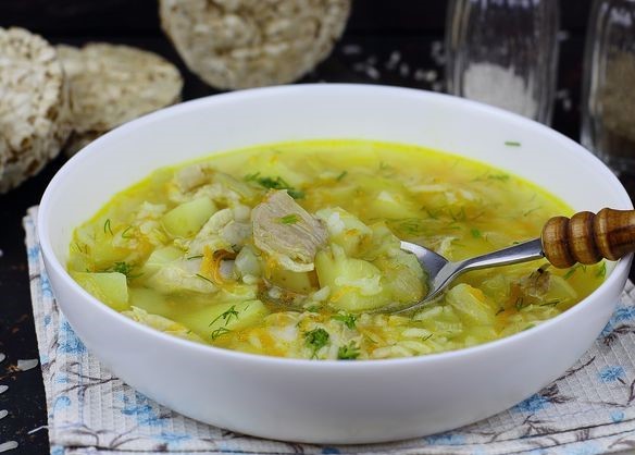 Рис тщательно промойте и отправьте в бульон. Приправьте суп лавровым листом, и черным перцем, посолите по вкусу. Картофель нарежьте небольшими кубиками и добавьте в кастрюлю через 10 минут после овощей и риса.