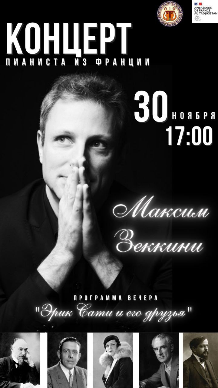 В Государственном академическом театре оперы и балета им. С. Айни 30 ноября в 17:00 состоится концерт французского пианиста Максима Зеккена. Программа вечера, наполненная музыкой Эрика Сати, Клода Дебюсси, Мориса Равеля, Франсиса Пуленка и других композиторов отправит зрителей в романтичный Париж. Максим Зеккен — выпускник Национальной музыкальной консерватории Парижа, уже покорил своим чарующим исполнением сердца миллионов, выступая на таких мировых сценах, как: «Карнеги-Холл» в Нью-Йорке, Пекинская опера, театр «Шатле», Эйфелева башня, Московская консерватория им. П. И. Чайковского и Парижская филармония и другие.