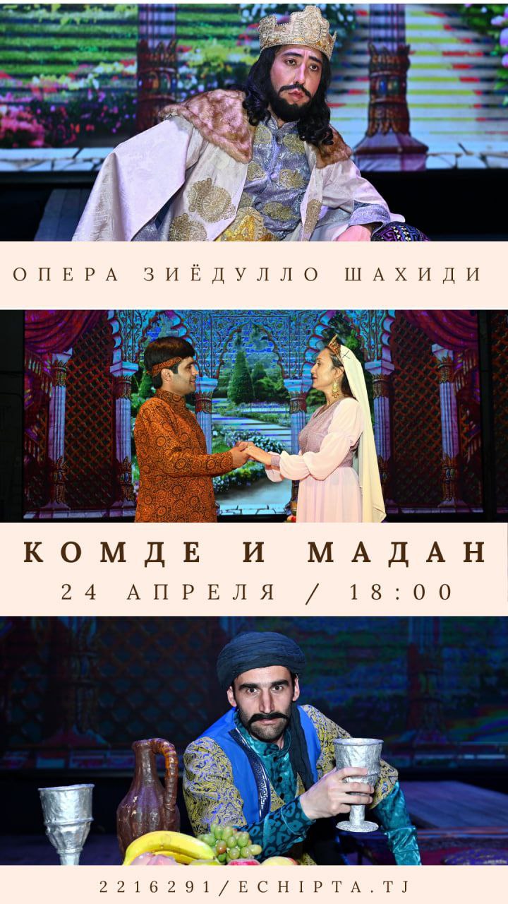 В Государственном академическом театре оперы и балета им. С. Айни 29 ноября в 17:00 состоится показ национальной оперы З. Шахиди «Комде и Мадан» в постановке Сухроба Усмонова. Главный режиссёр театра избрал необычный ракурс и готов представить публике новую редакцию знаменитого спектакля о двух влюблйнных. В постановке задействованы все коллективы театра: оркестр, солисты, балет и хор.