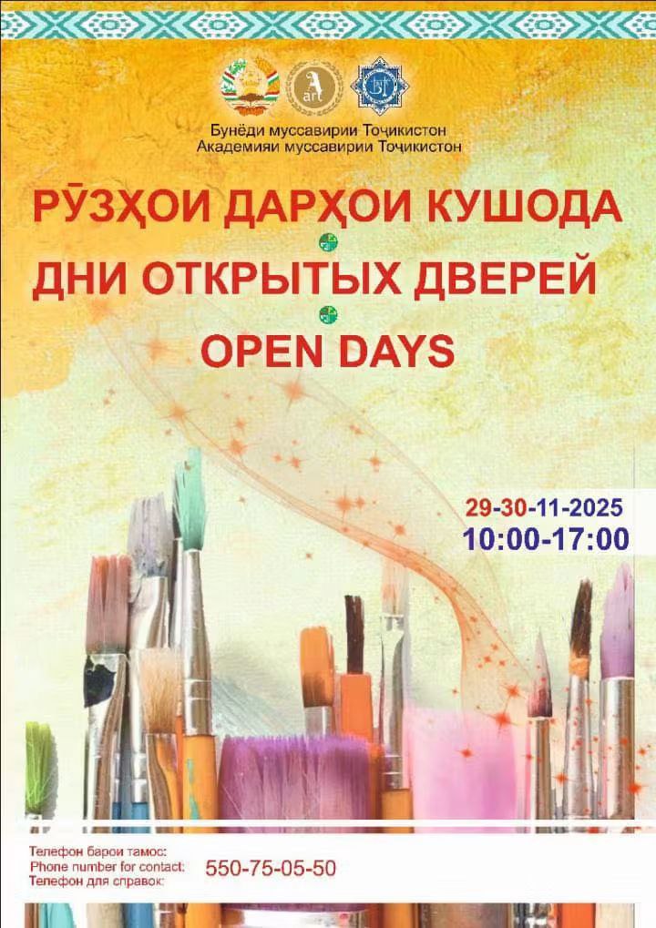 В Академии художеств Таджикистана (Худфонд) 29 и 30 ноября с 10:00 до 17:00 пройдут Дни открытых дверей. Это время, любой желающий будет дорогим гостем и может погрузиться в мир изобразительного искусства! Здесь вы можете не только посмотреть готовые работы (живопись, скульптура, резьба по дереву, мозаика), но и понаблюдать за процессом работы таджикских мастеров кисти. Понравившиеся работы можно приобрести из первых рук.
