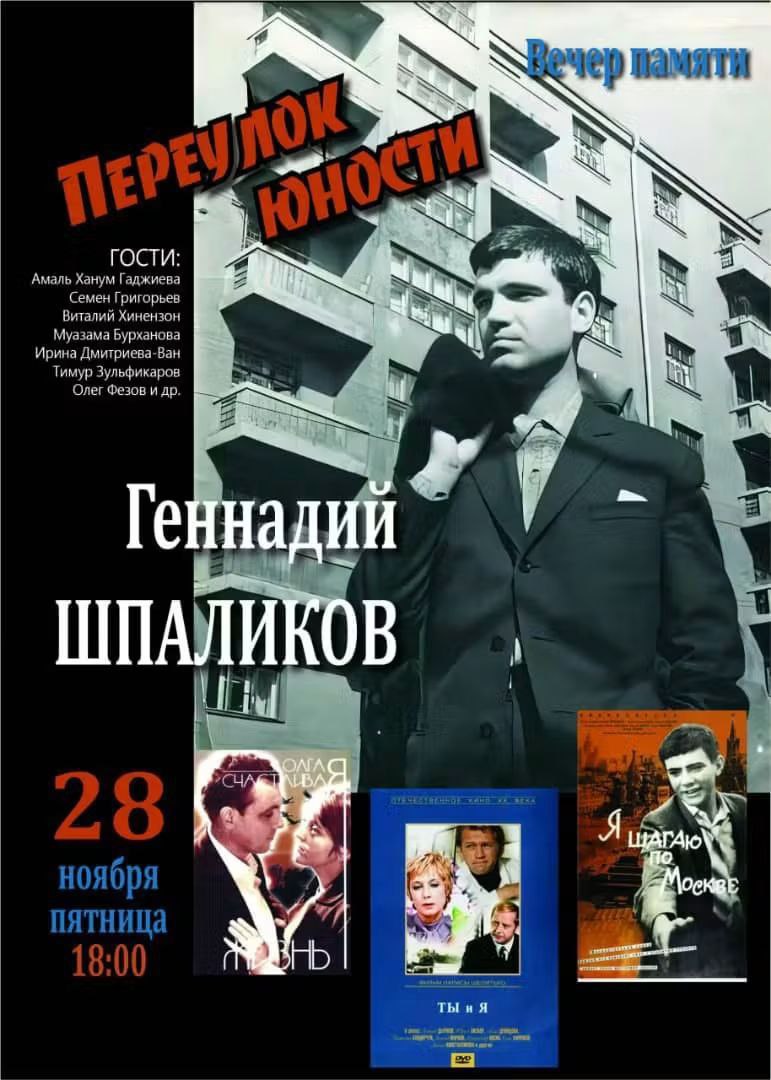 В кинокафе «У Нукри» 28 ноября в 18:00 пройдет вечер памяти Геннадия Шпаликова — советского киносценариста, кинорежиссёра и поэта. В качестве автора и соавтора он известен по фильмам: «Застава Ильича» (1962) и «Мне двадцать лет» (1965); «Я шагаю по Москве» (1963); «Я родом из детства» (1966); «Ты и я» (1971); «Пой песню, поэт…» (1971).