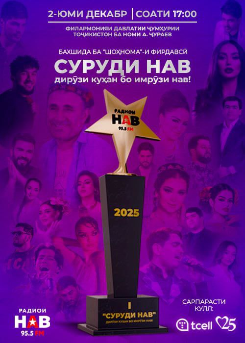 В Государственной филармонии им. А. Джураева 2 декабря в 18:30 состоится церемония награждения «Суруди Нав» от «Нового Радио». В концерте, посвящённом бессмертному эпосу «Шахнаме», выступят звезды таджикской эстрады: Нигина Амонкулова, Фаррух Хасанов, Карлеон, Барон, Мубориз Усмонов, Сафармухаммади Рустам, Фотима Машрабова, Хучастаи Мирзовали, Дилшоди Файзулло, Ситораи Кароматулло, Нобовар Чаноров, Никруз Зребунов, Зафар Абдуалимов, Умедджони Бурхон, Нишонаи Рустам, Мино Бахруллоева, Фарахноз Шарафова, Валиджон Азизов, Назар Усмони, Джахонгир Зарипов, Сумейя и Нилуфари Сарбоз.