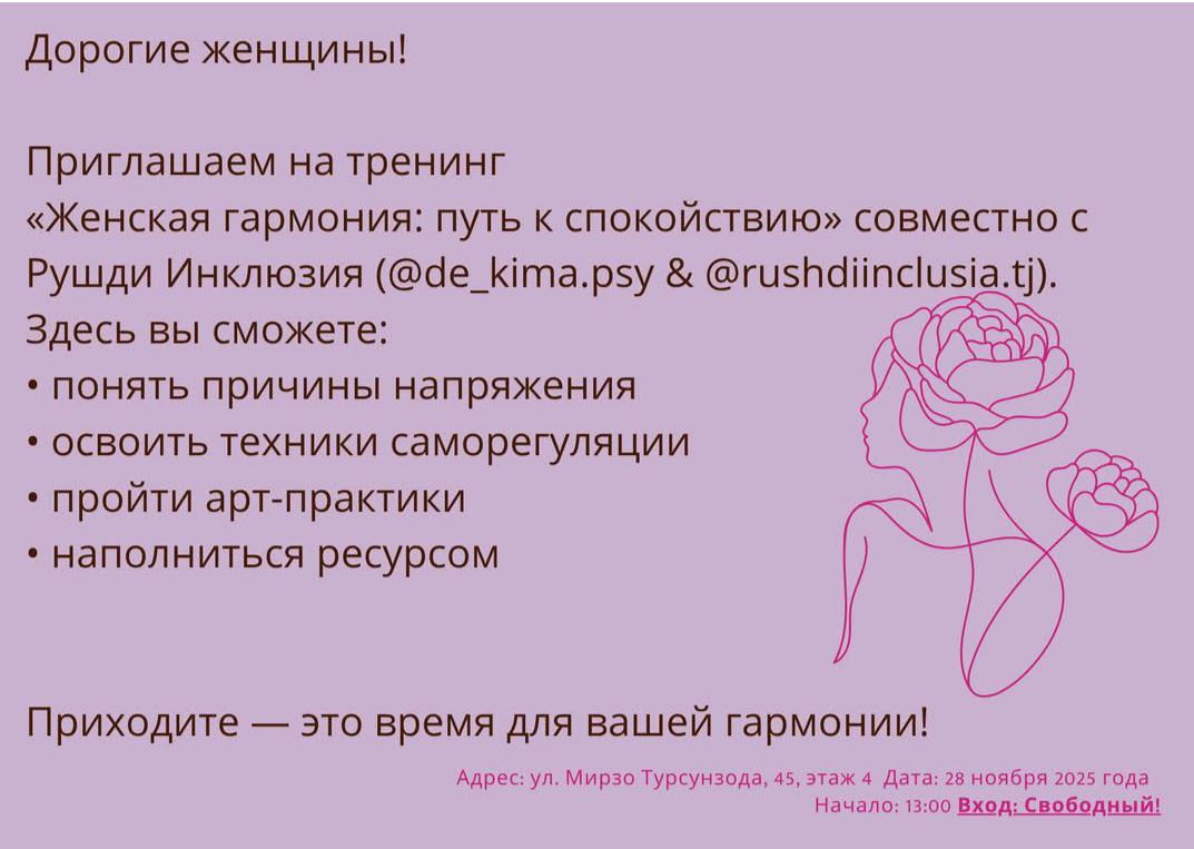 В здании ТЦ «Пойтахт» на 4 этаже 28 ноября в 13:00 стартует бесплатный трениг для прекрасной половины человечества «Женская гармония: путь к спокойствию», организованный при поддержке фонда Рушди Инклюзия. Погрузитесь в пространство заботы и поддержки, где вы сможете: понять причины внутреннего напряжения; освоить техники саморегуляции и расслабления; погрузиться в арт-терапевтические практики и наполниться вдохновением и ресурсом.