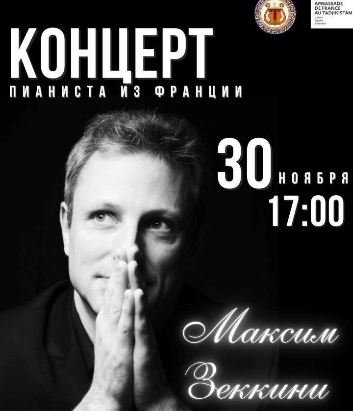 — В Государственном академическом театре оперы и балета им. С. Айни в 17:00 состоится концерт французского пианиста Максима Зеккена. Программа вечера, наполненная музыкой Эрика Сати, Клода Дебюсси, Мориса Равеля, Франсиса Пуленка и других композиторов, отправит зрителей в романтичный Париж. Максим Зеккен — выпускник Национальной музыкальной консерватории Парижа, уже покорил своим чарующим исполнением сердца миллионов, выступая на таких мировых сценах, как: «Карнеги-Холл» в Нью-Йорке, Пекинская опера, театр «Шатле», Эйфелева башня, Московская консерватория им. П. И. Чайковского и Парижская филармония и другие. Стоимость билета: 55 сомони. Билеты доступны на сайте echipta.tj.