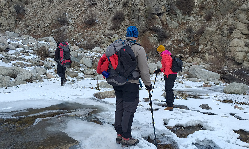 Нагрузившись рюкзаками с провизией, мы двинулись в путь. Важным атрибутом похода выступила треккинговая палка. Она помогала не скатиться с берегового склона и прощупывать на прочность ледовую корку реки.