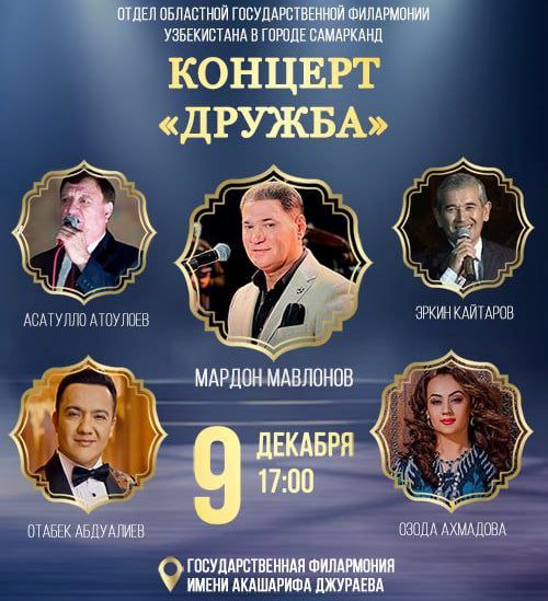 — В Государственной филармонии им. А. Джураева в 17:00 пройдёт «Концерт Дружбы». Здесь на одной сцене встретятся традиции, культура и музыка. Этот вечер станет особенным благодаря участию артистов из Узбекистана, чьи голоса давно завоевали сердца таджикских слушателей. В программе примут участие Отабек Абдуалиев, Асатулло Атоулоев, Мардон Мавлонов, Эркин Кайтаров и Озода Ахмадова. Гостей ждут любимые хиты, новые впечатления и теплая атмосфера. Стоимость билетов: от 100 сомони. Билеты доступны на сайте ticketon.tj.