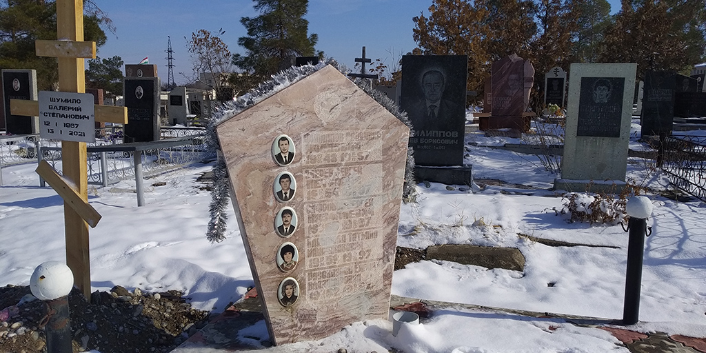 Мы останавливаемся у запорошенных снегом надгробных плит с выгравированными именами пяти членов экипажа рейса Худжанд-Шарджа, погибших 15 декабря 1997 года.