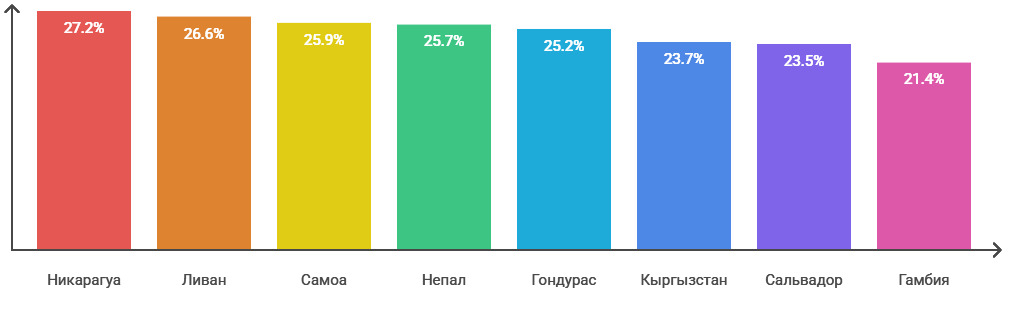 За Таджикистаном с довольно приличным отрывом идет тихоокеанское островное государство Тонга — 38,2% ВВП. Далее следуют: