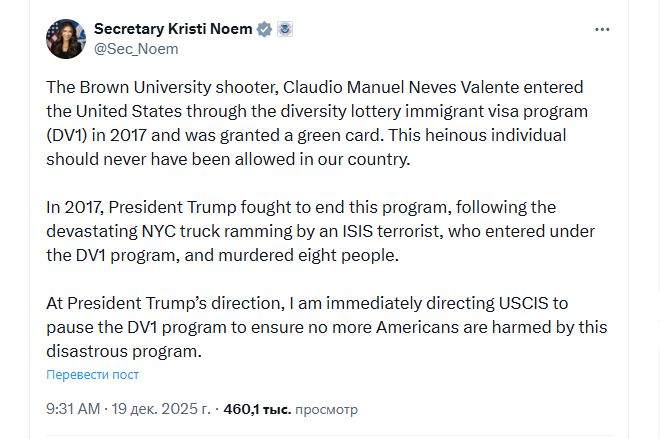 «По указанию президента Дональда Трампа, я приказываю приостановить программу DV1 для предотвращения дальнейшего ущерба американцам от этой программы», — заявила Ноэм.