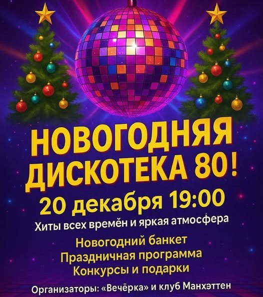 — В клубе «Манхэттен» в 19:00 пройдет традиционная новогодняя дискотека 1980-1990-х. Гостей ждут легендарные хиты, новогодняя программа, конкурсы и подарки. Стоимость билета: 410 сомони. Бронь по телефонам: 907310555, 909020009.