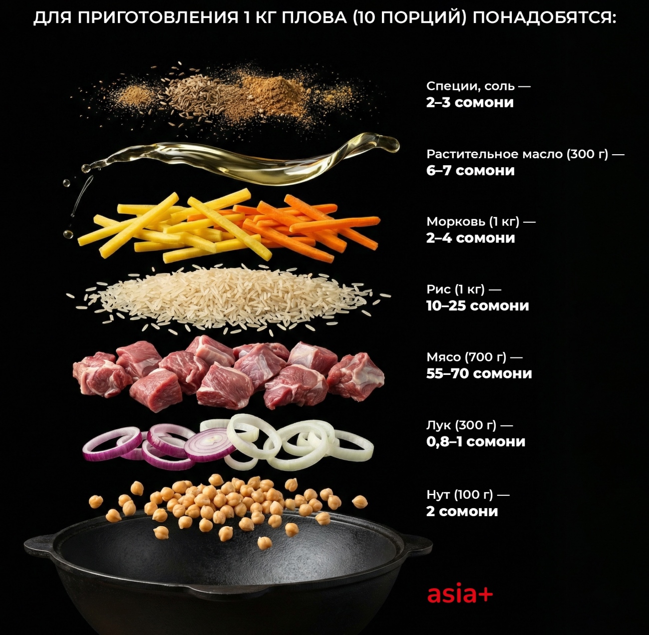 Итак, общая стоимость приготовления 1 кг плова составит от 93,8 до 117 сомони на 10 человек/порций.