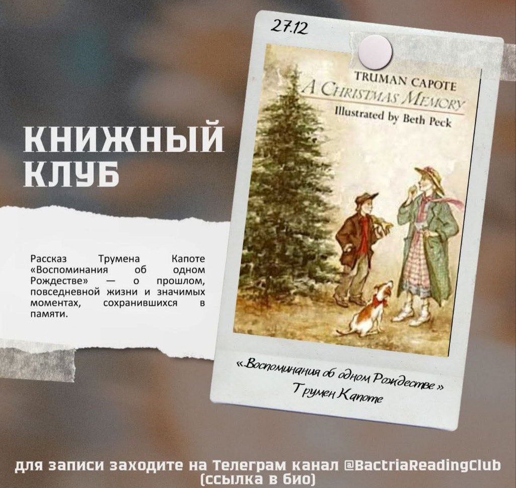 В Культурном центре «Бактрия» 27 декабря в 17:00 пройдёт заключительная в этом году встреча читательского клуба. На этот раз состоится обсуждение теплого ностальгического рассказа Трумена Капоте «Воспоминания об одном Рождестве». Проведите этот вечер вместе — за традиционным чаепитием и разговором о прочитанном. Рассказ нужно прочитать заранее, время чтения — около 15 минут. Рассказ можно скачать здесь.