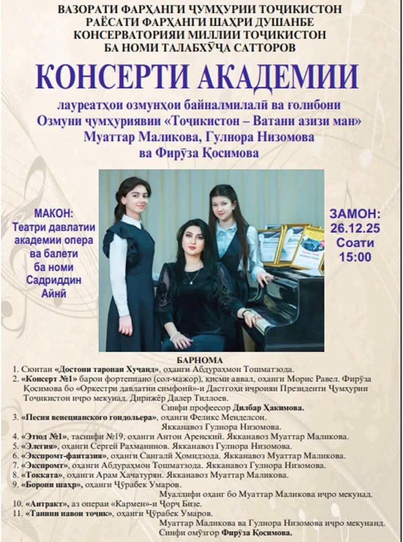 В Государственном академическом театре оперы и балета им. С. Айни 26 декабря в 15:00 состоится академический концерт лауреатов международных конкурсов и победителей республиканского конкурса «Таджикистан — моя дорогая Родина» Фирузы Косимовой, Муаттар Маликовой и Гульноры Низомовой. В программе прозвучат известные произведения мировой классики.
