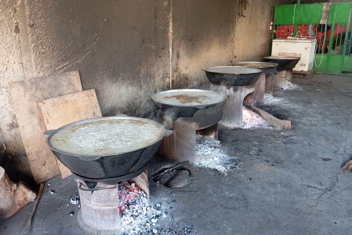 Каждое утро работники приходят, убирают за собаками, разводят огонь и готовят на дровах кашу на мясном бульоне в пяти огромных котлах. Вокруг толпятся притихшие и терпеливые собаки — их голодные глаза блестят надеждой. Эта каша — единственная еда, которая позволяет не умереть от голода и немного согреться. Обильное питание животные получают раз в день.