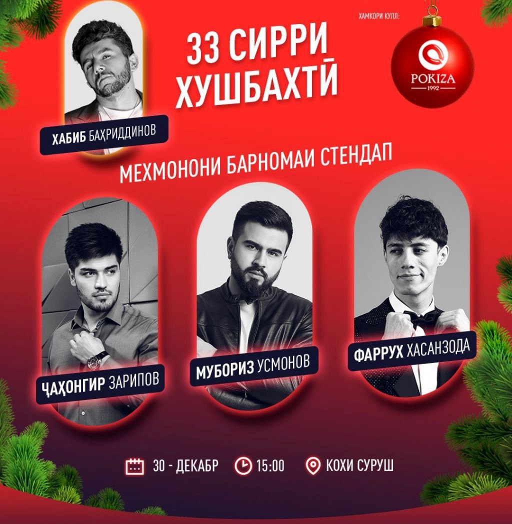 — В концертном зале «Кохи Суруш» в 15:00 пройдёт стендап-концерт «33 – секрет счастья», посвященный 33-летию компании Pokiza. В программе не только выступления талантливых комиков, но и розыгрыш ценных призов. Стоимость билета: от 50 до 150 сомони. Билеты доступны на сайте echipta.tj.