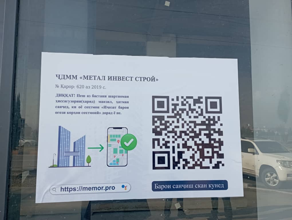 На заборах стройплощадок и входах в отделы продаж строительных компаний в городе Душанбе установлены QR-коды. По ним можно проверить все об объекте – от информации о том, кто является владельцем строительной компании до документов, удостоверяющих законность строительства.