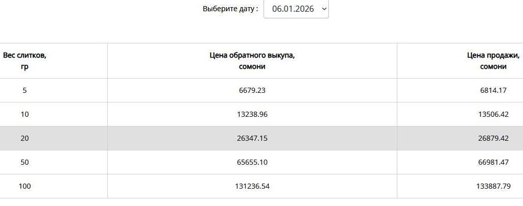 Стоимость 5-граммового слитка, по данным НБТ, в течение 2025 года выросла на 1 832.19 сомони (на 38,34%) и на 1 января наступившего года составила 6610,42 сомони. А 100-граммовый слиток подорожал на 36 737.98 сомони (на 39,47%), и стоил на 1 января этого года 129 812,90 сомони.