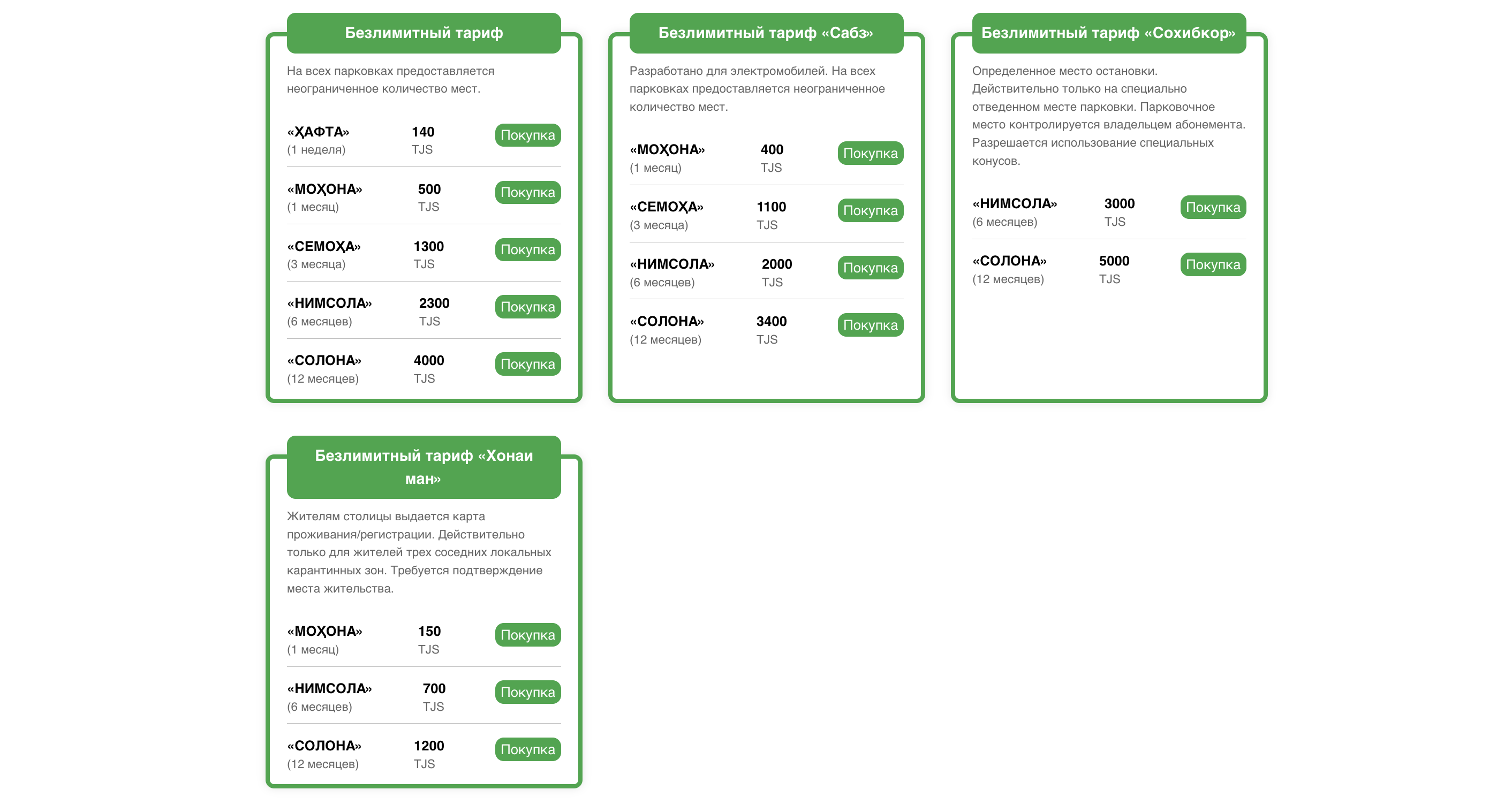 Тариф «Хонаи ман» удобен для жителей столицы, которые чаще всего паркуются возле дома. Если вы возвращаетесь вечером и не хотите каждый раз искать место или переживать за оплату, этот абонемент позволяет спокойно парковаться в своём районе в пределах трёх (3) паркозон по доступной цене, что выходит дешевле на 70 процентов. Он особенно актуален для семей и людей, которые ежедневно используют автомобиль в бытовых целях.