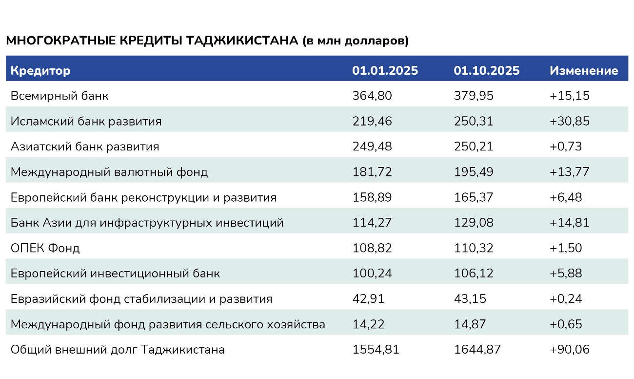 Кроме того, согласно данным Министерства финансов Таджикистана, страна также имеет значительные долги перед Всемирным банком, Азиатским банком развития, Исламским банком развития и Европейским банком реконструкции и развития.