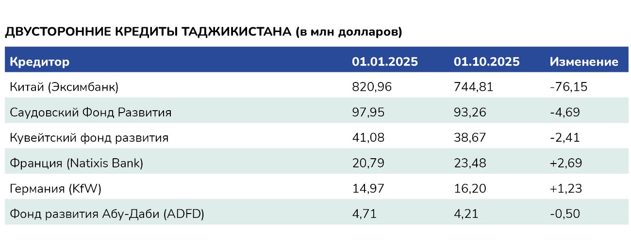 Среди кредиторов Таджикистана на первом месте Китай. Согласно официальным данным, Душанбе задолжал Пекину более $700 миллионов, что составляет более четверти общего внешнего долга. Кредиты Таджикистану от Китая предоставляются через Эксимбанк Китая и направлены на реализацию инфраструктурных проектов, включая строительство дорог и объектов энергетики.