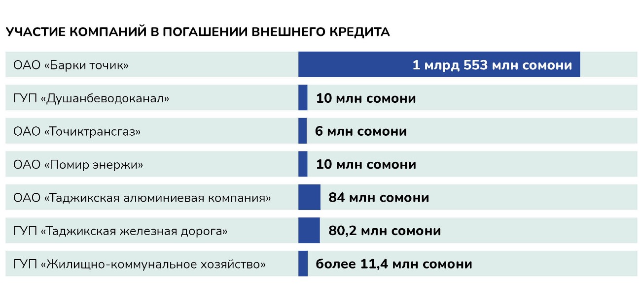 На обслуживание долга будут выделены не только средства из государственного бюджета, но и от предприятий. Например, компания «Барки точик» должна будет выделить 1,553 млрд сомони — это самая крупная сумма среди предприятий. Таджикская алюминиевая компания заплатит 84 млн сомони, Таджикская железная дорога — 80,2 миллиона сомони.