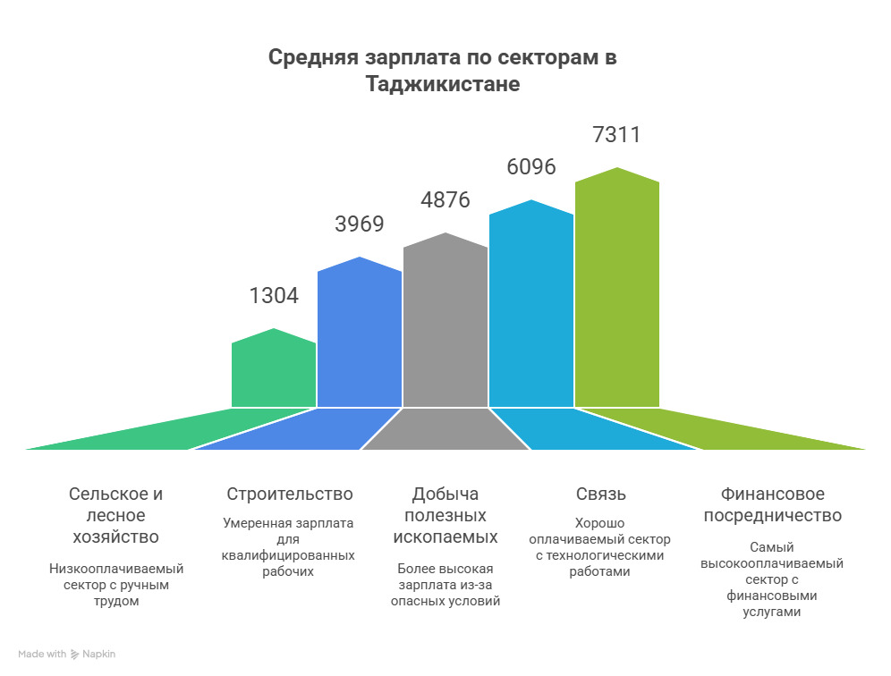 Средняя номинальная заработная плата в октябре 2025 года составила 3 тыс. 123 сомони ($335). Однако зарплаты в разных секторах экономики до сих пор сильно различаются. К примеру: