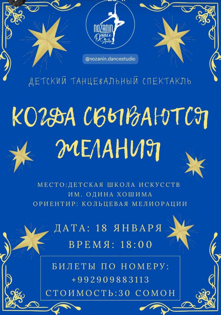 В Детской школе искусств им. Одина Хошима 18 января в 18:00 состоится показ детского танцевального спектакля «Когда сбываются желания» в постановке Нозанин Юльчиевой. Приходите и посмотрите какие у нас в городе есть талантливые дети!