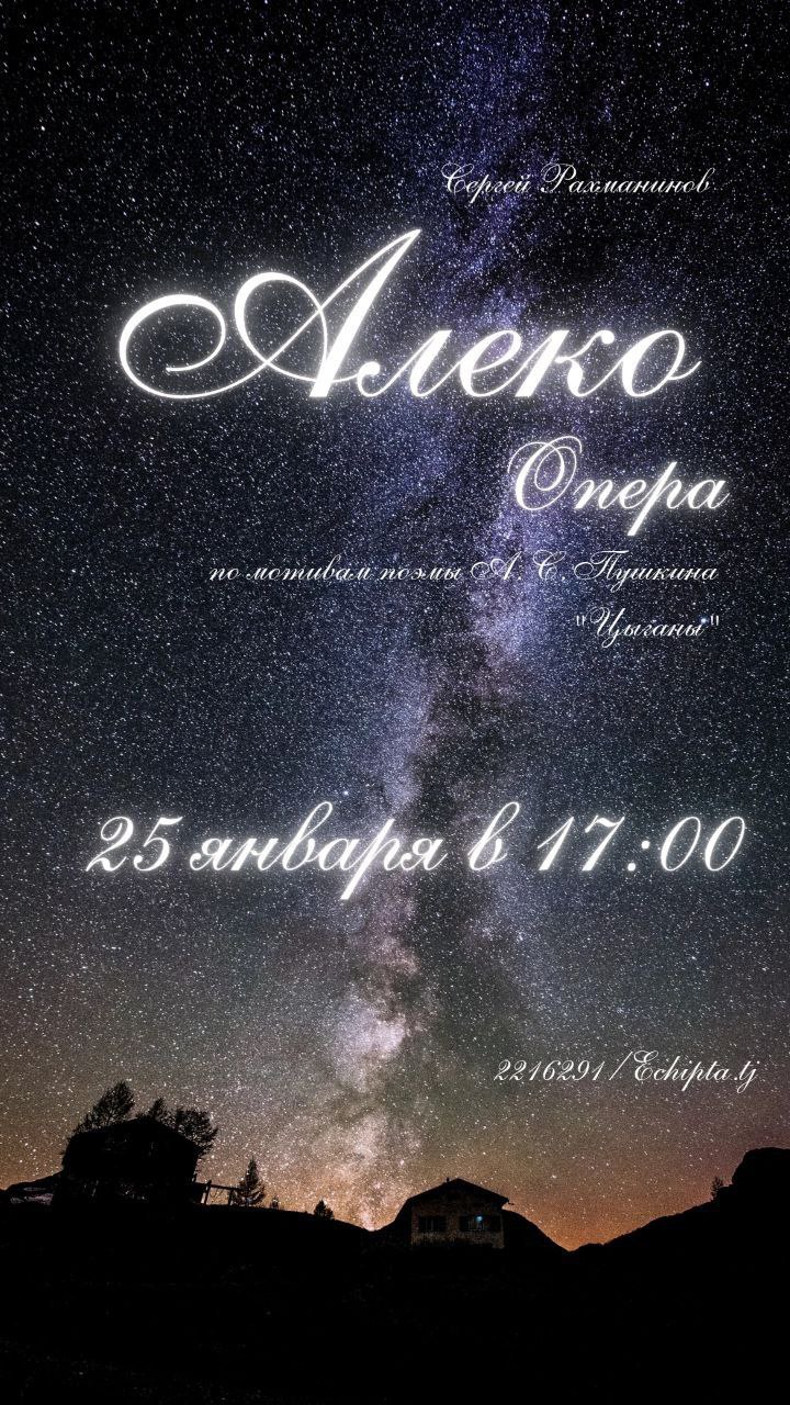 В Государственном академическом театре оперы и балета им. С. Айни 25 января в 17:00 состоится показ легендарной и первой оперы С. Рахманинова «Алеко», написанной по мотивам произведения А.С. Пушкина. Композитор написал её ещё в юности, но даже спустя много лет музыка поражает своей эмоциональной силой, искренностью и мощью.
