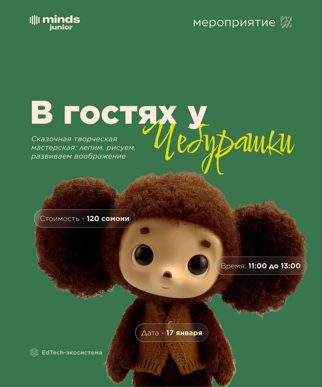 В Minds junior 17 января с 11:00 до 13:00 пройдёт увлекательное творческое мероприятие для детей «В гостях у Чебурашки». Маленьких гостей ждёт вдохновляющая сказочная атмосфера, в которой они будут рисовать, лепить и развивать своё воображение.