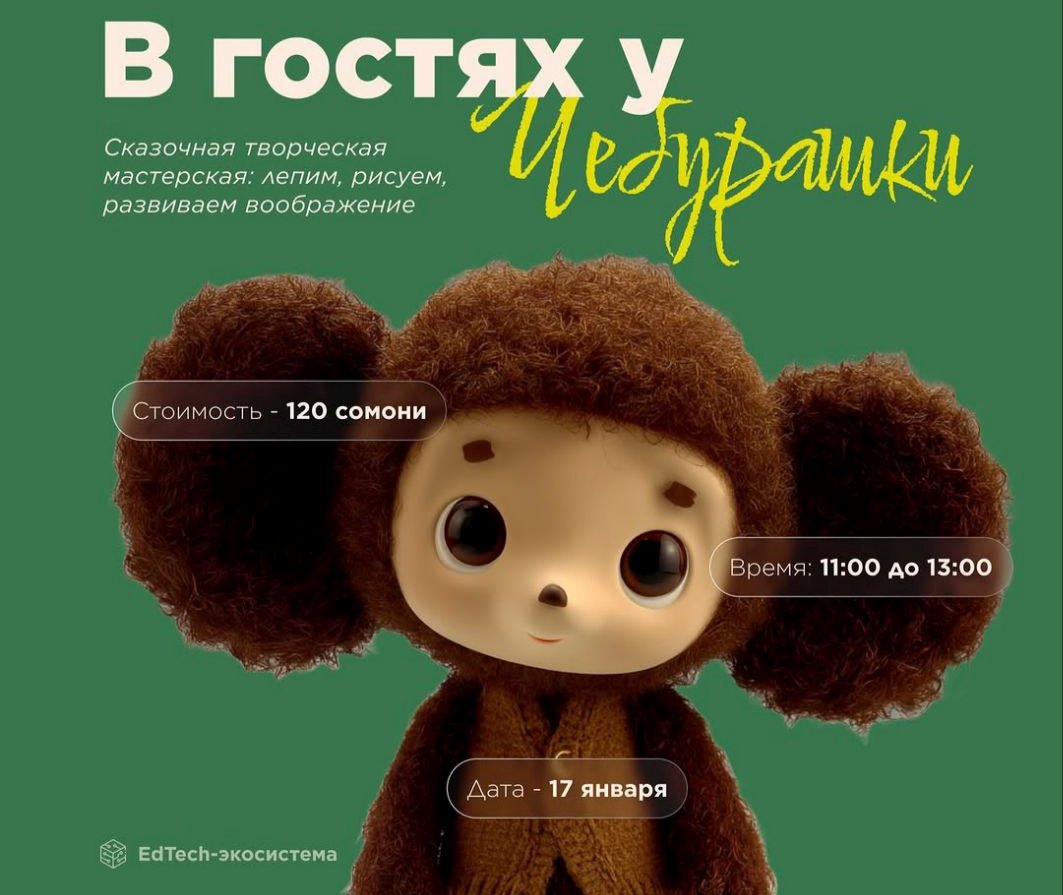 — В Minds junior с 11:00 до 13:00 пройдет увлекательное творческое мероприятие для детей «В гостях у Чебурашки». Маленьких гостей ждет вдохновляющая сказочная атмосфера, в которой они будут рисовать, лепить и развивать своё воображение. Стоимость участия: 120 сомони. Адрес: ул. Бухоро, д. 78.