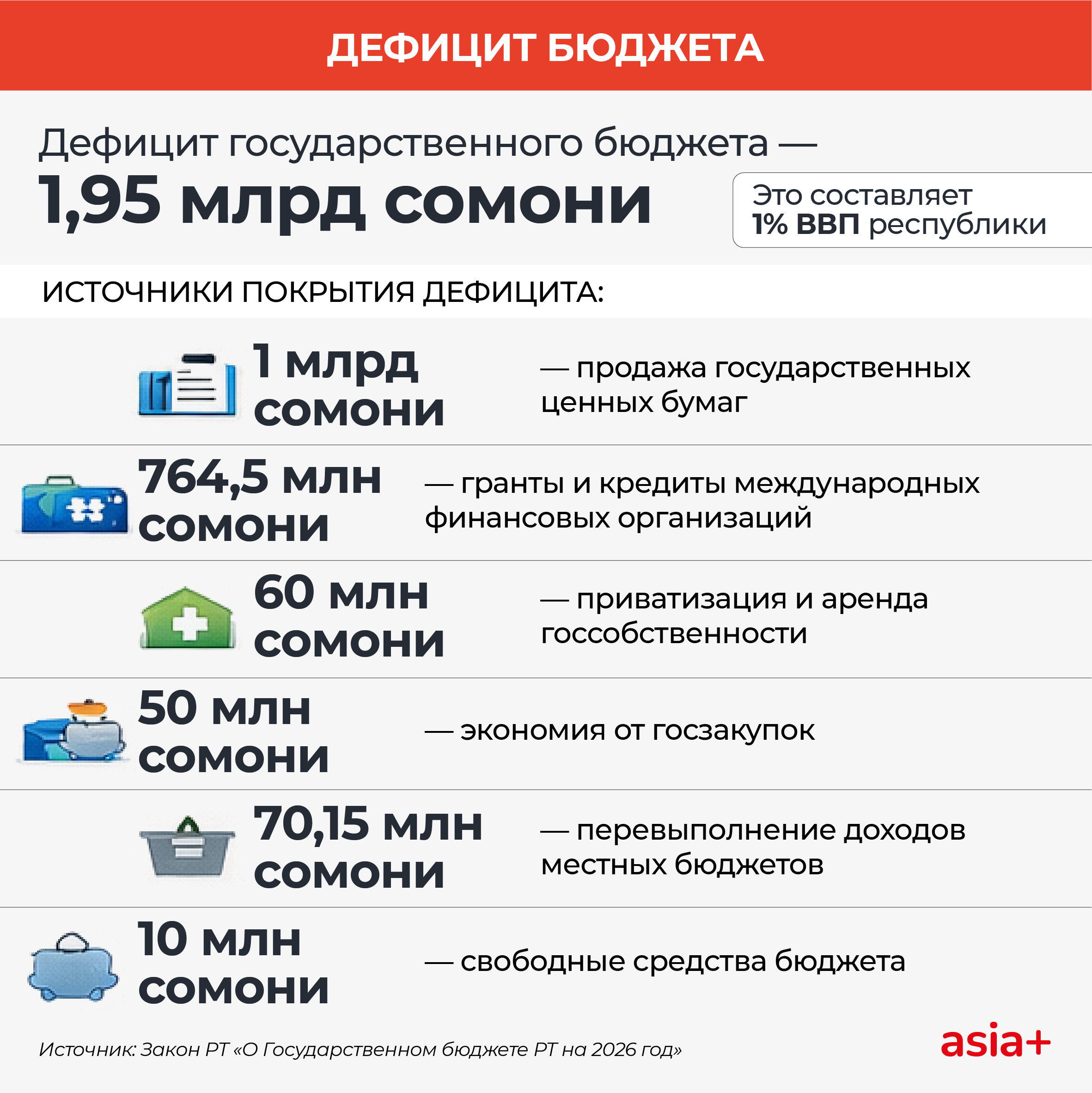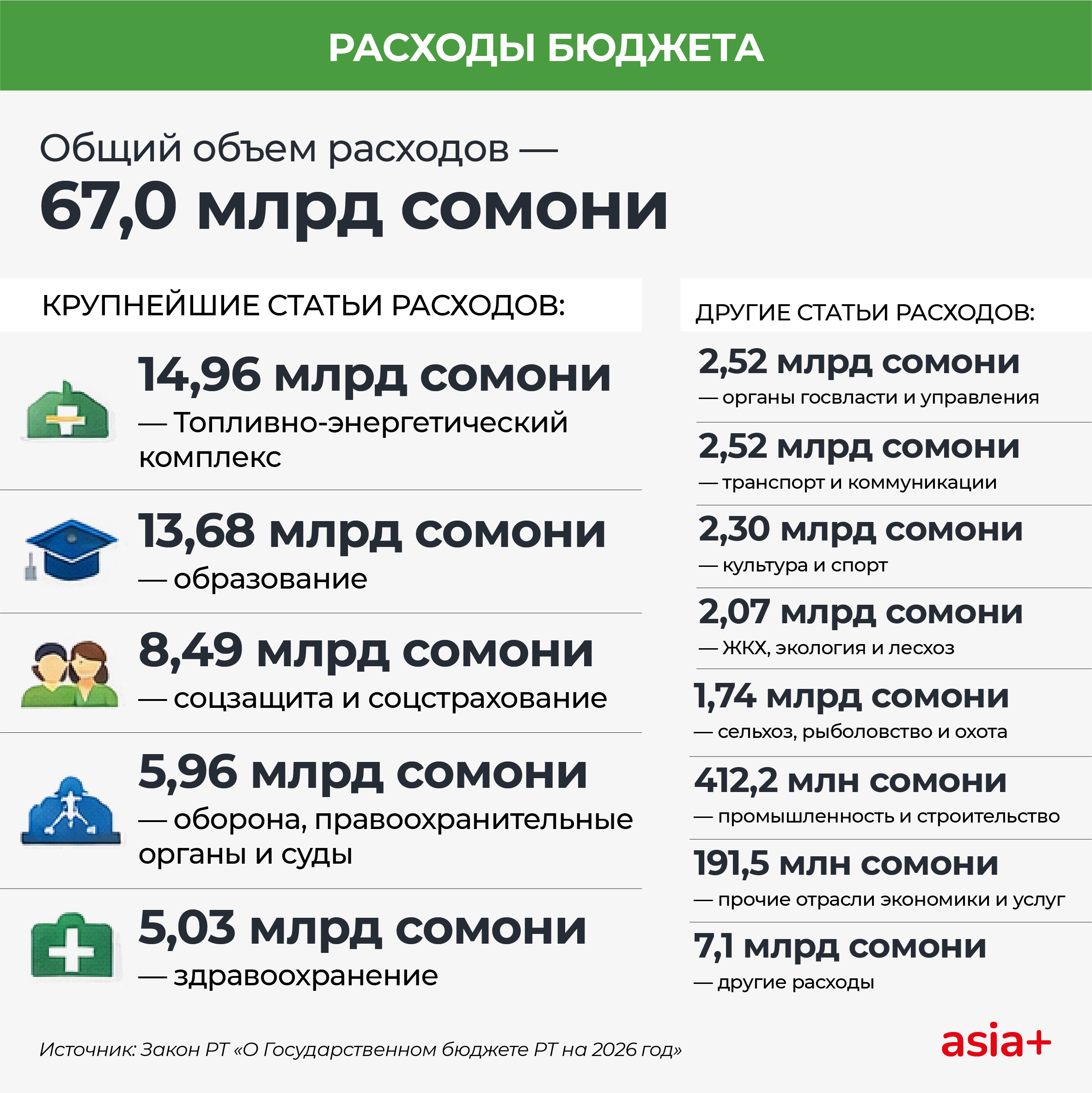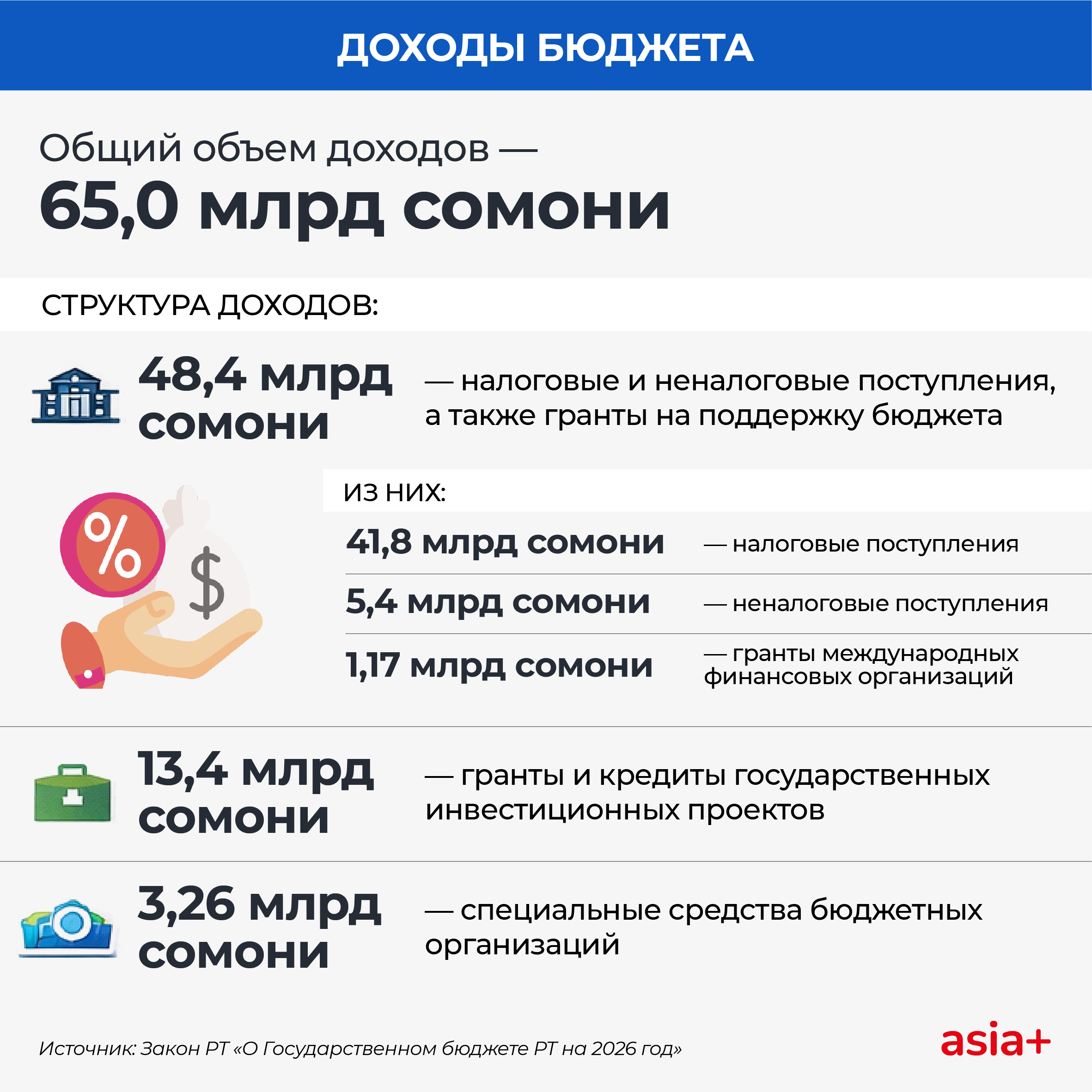 В проекте госбюджета Таджикистана на 2026 год доходы страны запланированы на уровне 65 млрд сомони, расходы — 67 млрд, при дефиците в 1% ВВП; больше всего средств направят на энергетику, образование и социальную защиту, а недостающие деньги покроют за счёт заимствований и продажи гособлигаций.
