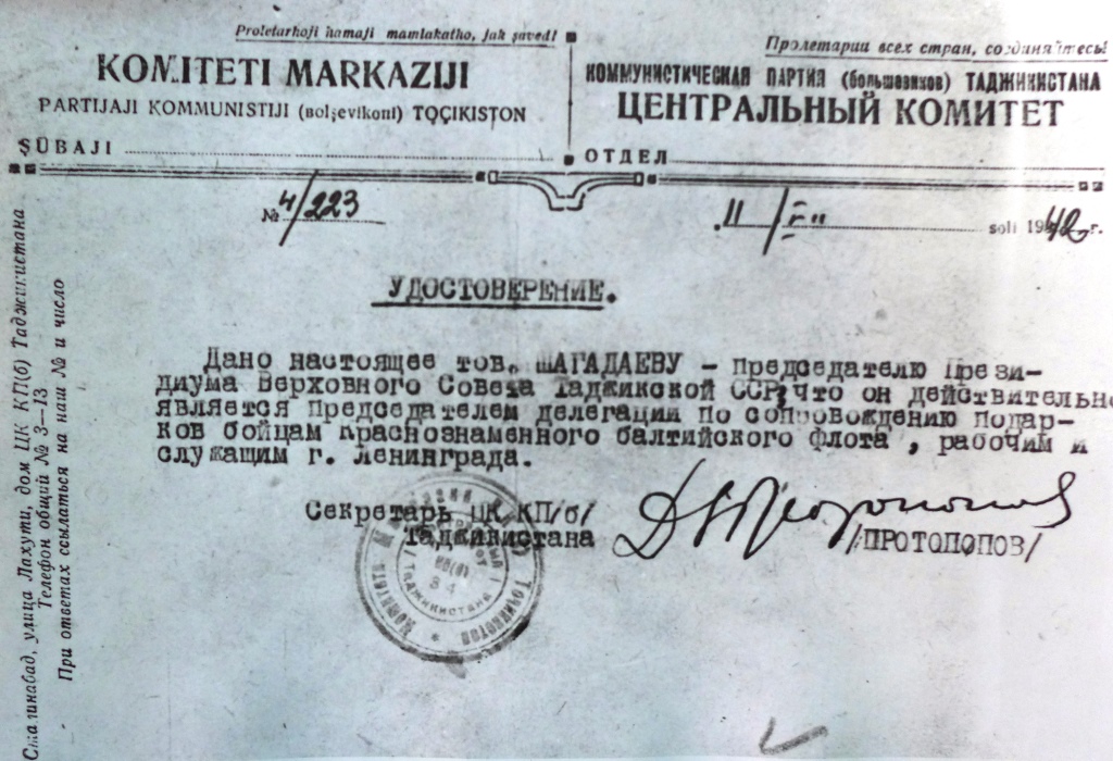 «Нет слов, чтобы выразить чувство благодарности, которым наполнены наши сердца за ваше внимание и заботу о нас, ленинградцах… На поле битвы рука об руку с русскими братьями защищают советскую землю доблестные сыны таджикского народа».