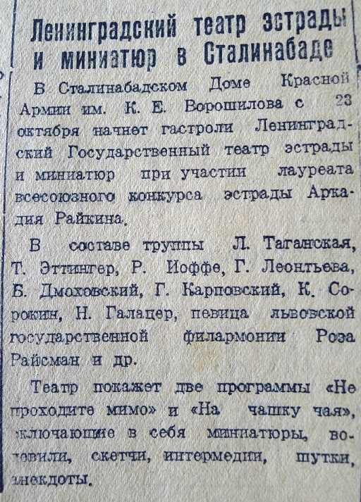 В октябре–декабре 1941 года в Сталинабад, спасаясь от ужасов войны, начали прибывать театральные коллективы из оккупированных районов. Среди них — Ленинградский театр эстрады и миниатюр Аркадия Райкина, Ленинградский театр комедии и другие.