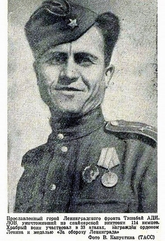 Громкая слава шла о снайперах Тешабое Адилове и Шукурулло Исаеве. В газете «Комсомольская правда» в 1942 году был опубликован очерк «Ленинградец — Тешабой Одилов». К середине 1942 года на его счету было более 100 уничтоженных солдат и офицеров противника.