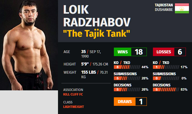Лоику Раджабову (Таджикистан) с рекордом 18-6-1 (2-2 в UFC) — 35 лет, а решение промоушена вызвало вопросы, поскольку у бойца нет очевидного общего критерия для увольнения.