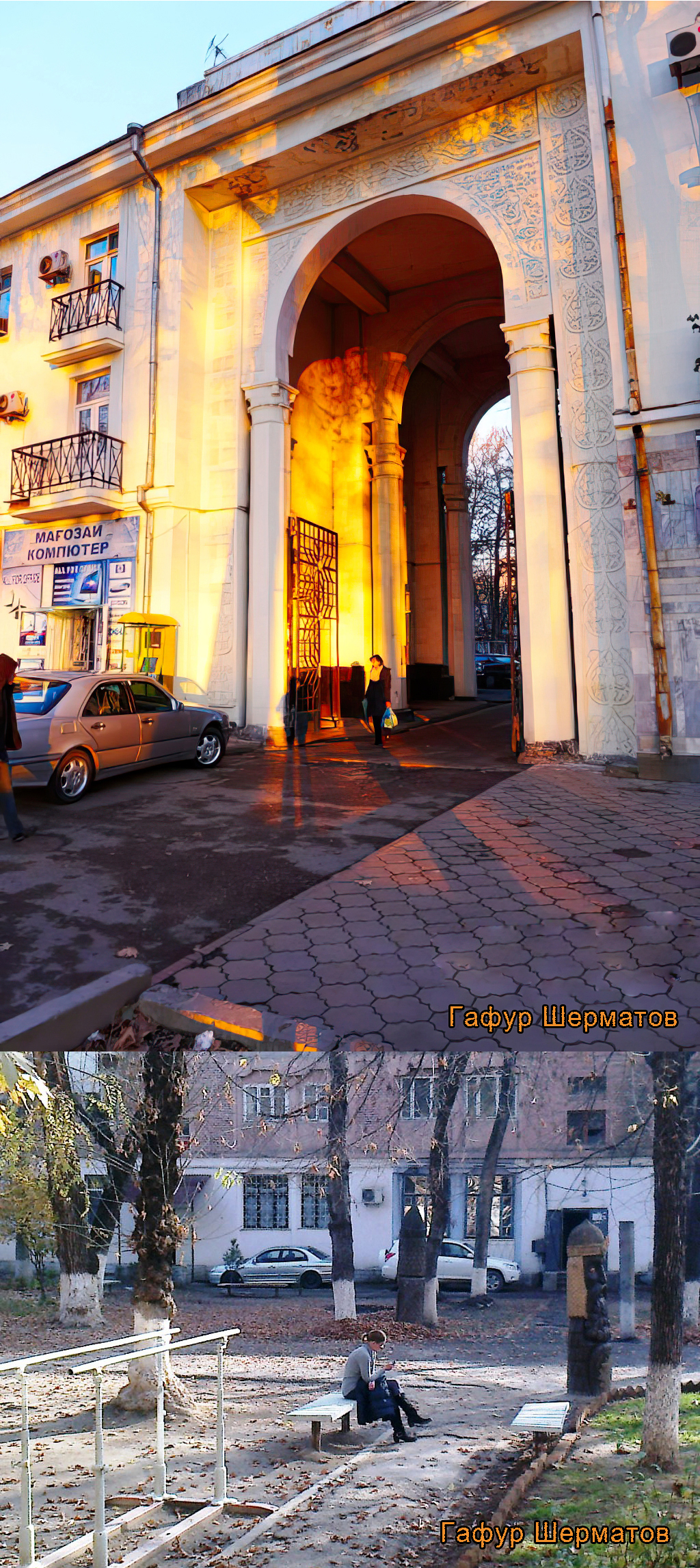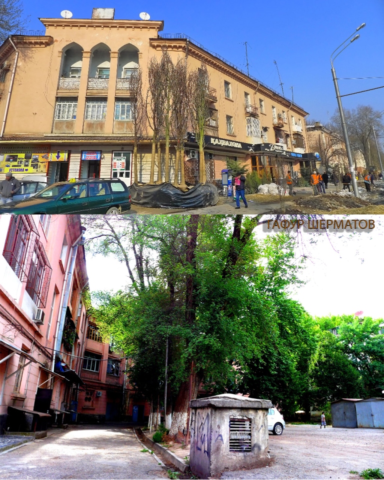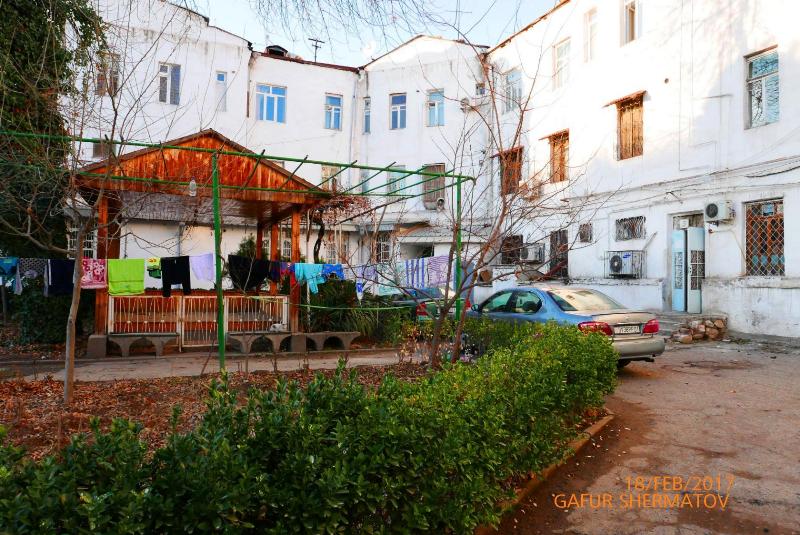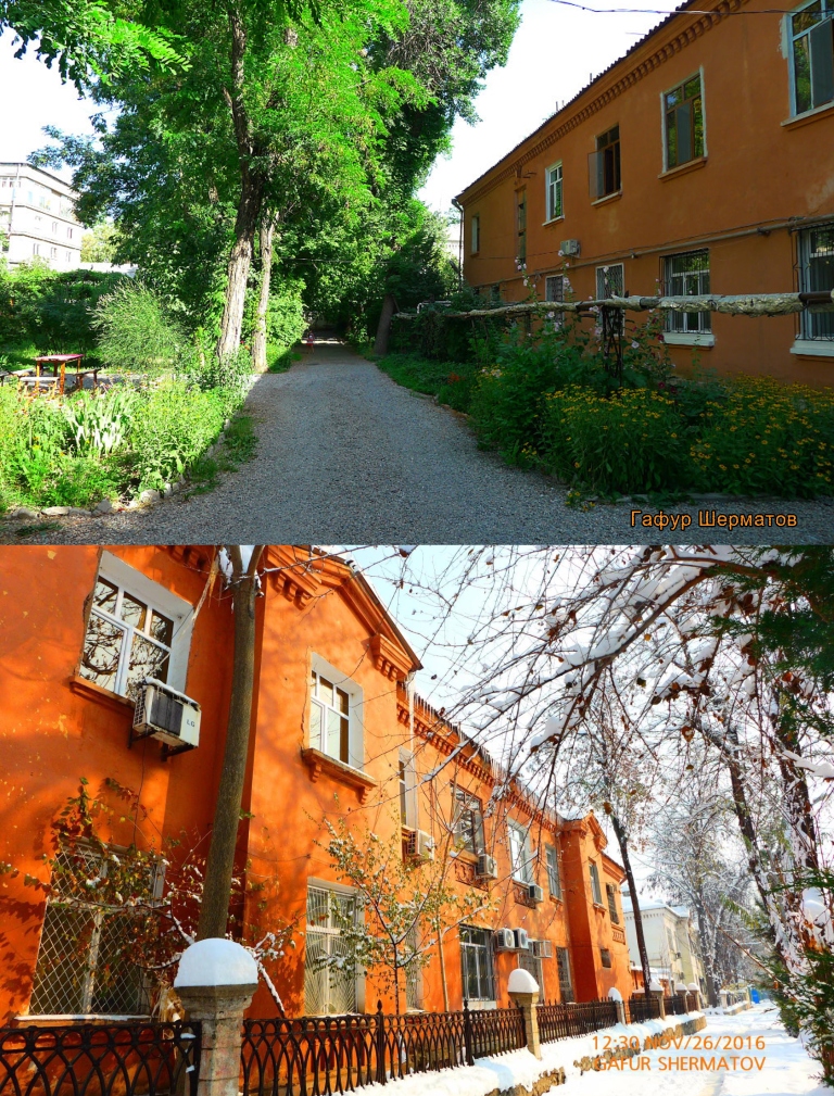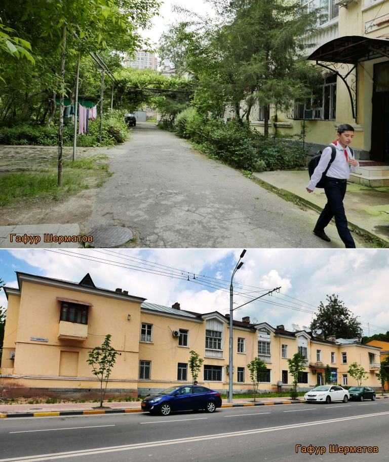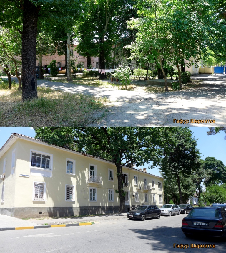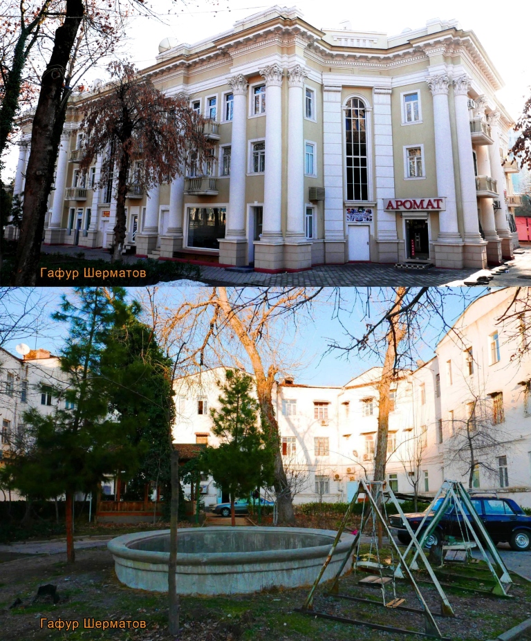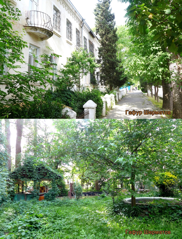Больше всего в сталинабадских двориках мне нравится их камерность — до середины 1950-х годов в городе стремились строить закрытые дворы, территория которых была отгорожена от улицы красивыми железными решетками, у которых были ворота и калитки.