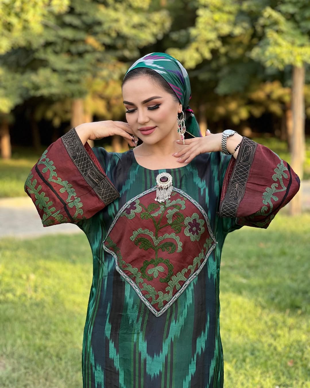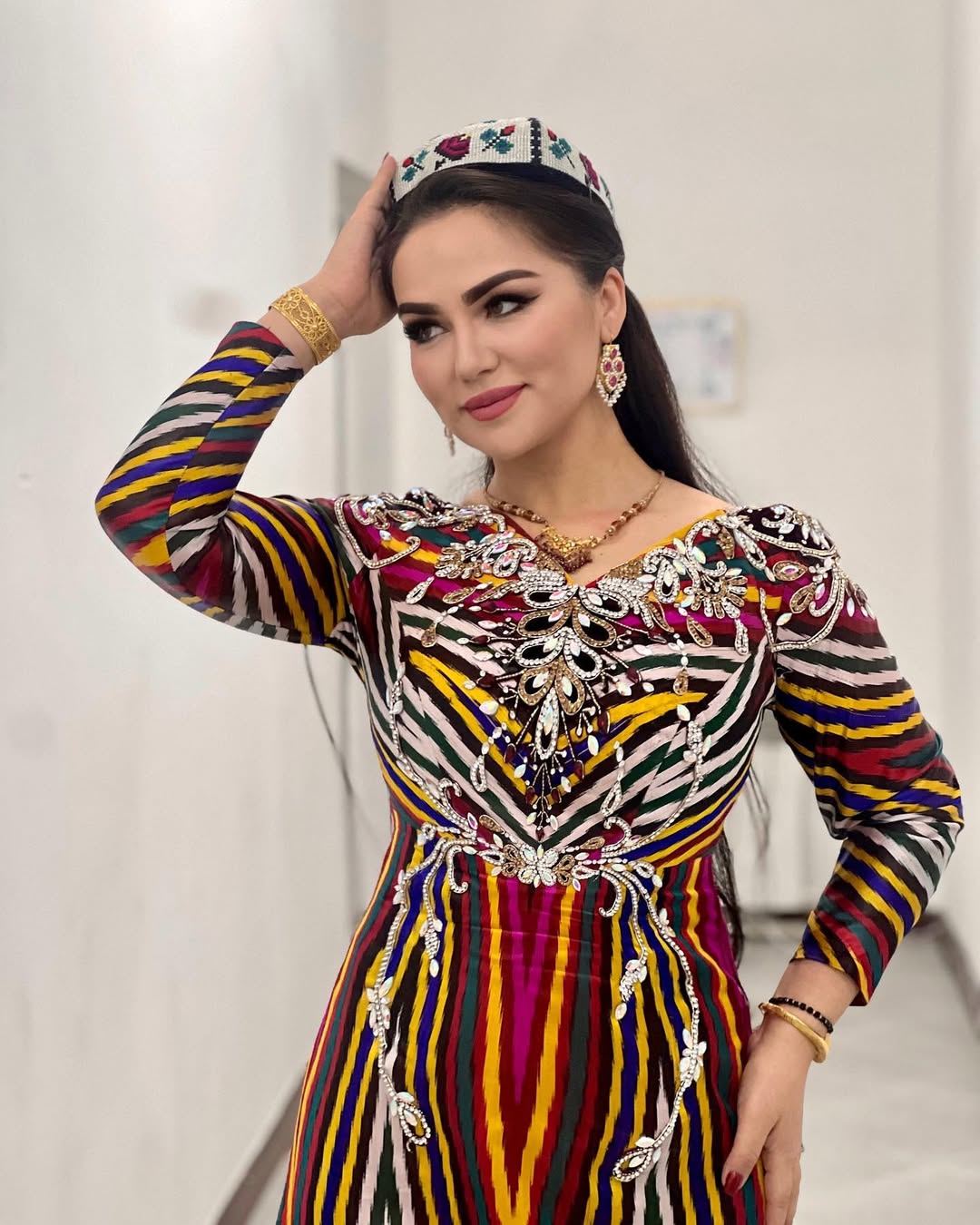 «С детства я люблю носить одежду из атласа и адраса. За то время, что я выхожу на сцену как артистка, я надела около 800 видов национальной одежды. На своём первом выступлении я тоже была в национальном костюме. Меня узнали и полюбили именно по этому стилю одежды. Пока я на сцене, я не перестану носить атлас и адрас».