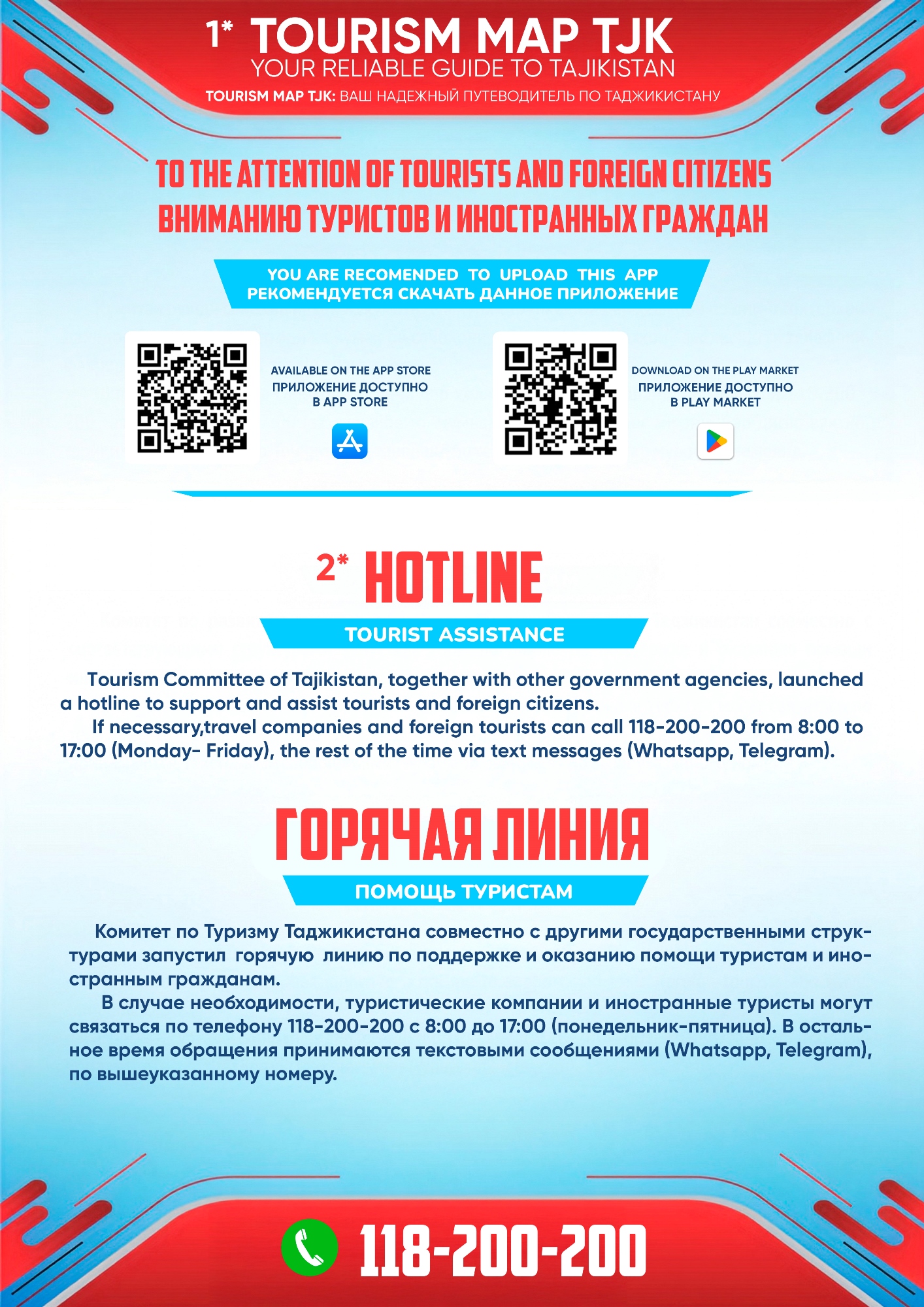 Совет: в любой сложной или непредвиденной ситуации вы можете позвонить по телефону горячей линии Госкомитета по развитию туризма Таджикистана по номеру: +992 118-200-200. Линия доступна с понедельника по пятницу с 8:00 до 17:00. В нерабочее время сообщения принимаются через WhatsApp или Telegram — специалисты обязательно ответят.