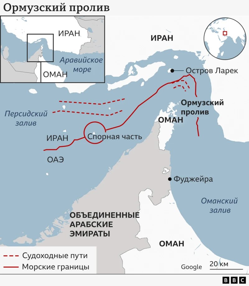 Одновременно, Тегеран угрожает массированным ответным ударом по американской группировке, базам США в регионе и Израилю; но самое главная угроза, это возможное перекрытие иранцами Ормузского пролива, через который проходит 20% всей транспортируемой морем нефти и 30% газа в мире.