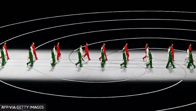 Модели стройными рядами прошли по сцене в одеждах цветов итальянского флага, а сам флаг поднялся над стадионом под звуки национального гимна страны.