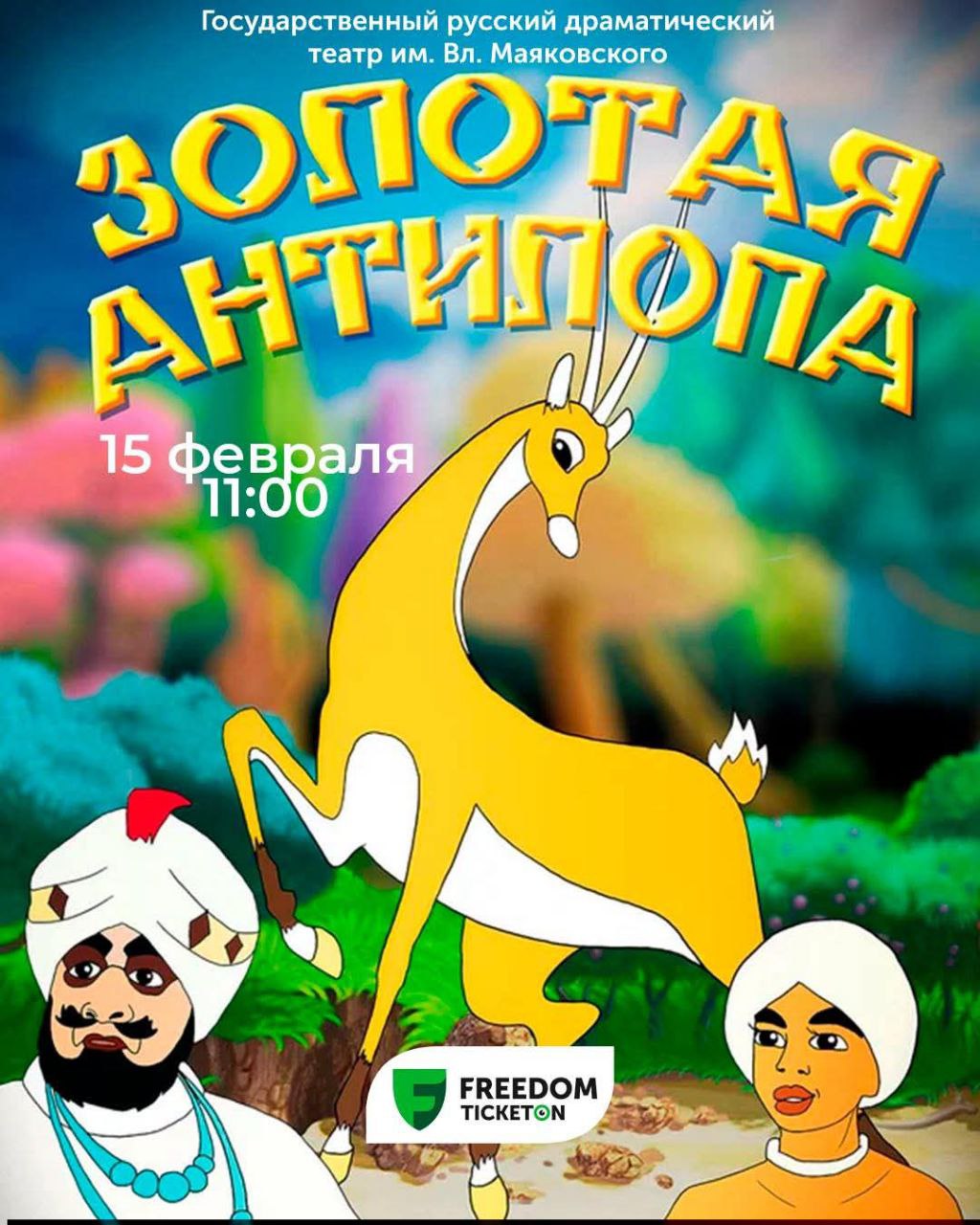 В Государственном русском драматическом театре им. В. Маяковского 15 февраля в 11:00 состоится показ спектакля «Золотая антилопа» в постановке Неккадама Шоназарова. Это спектакль по мотивам известной сказки о бедном, но благородном юноше, сказочной антилопе и жадном радже.
