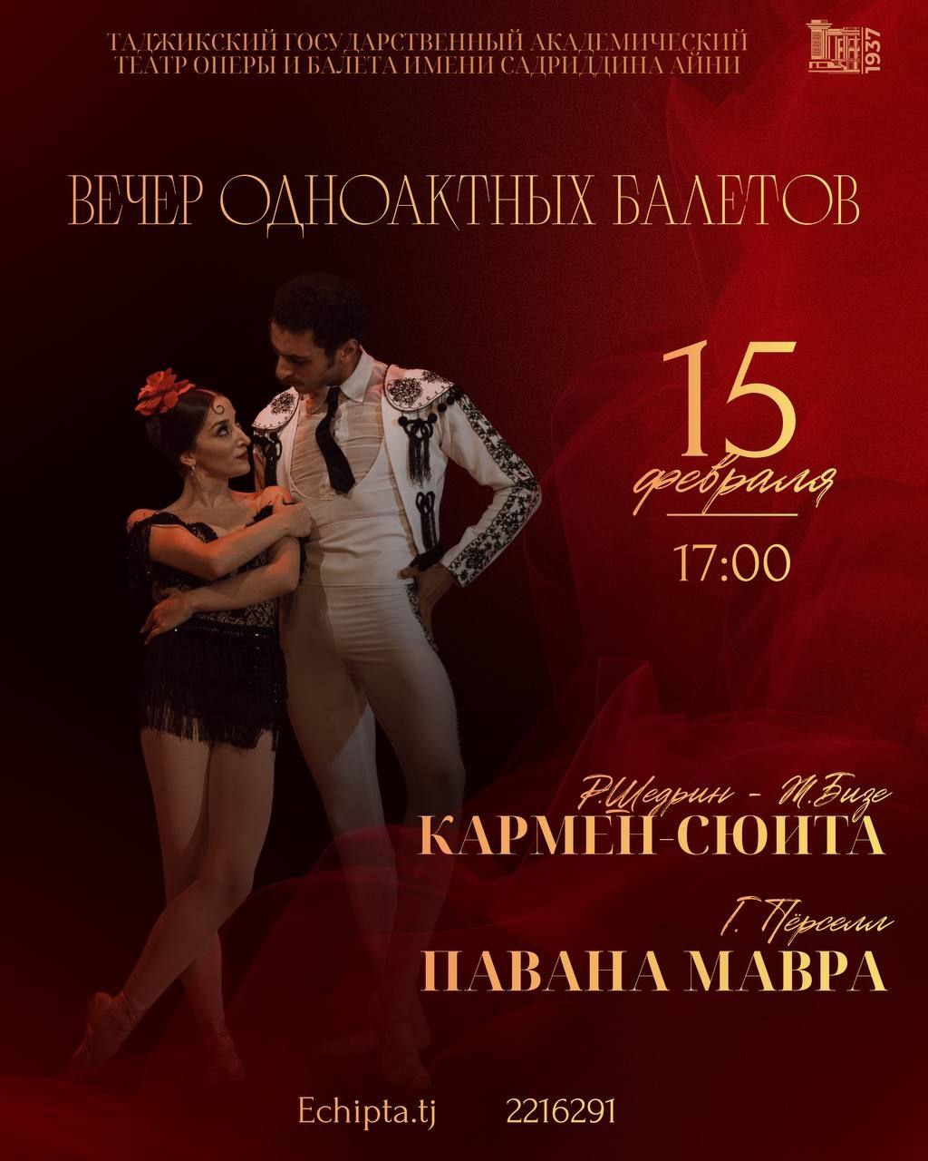 В Государственном академическом театре оперы и балета им. С. Айни 15 февраля в 17:00 пройдёт «Вечер одноактных балетов». В программе: «Кармен-сюита» (Ж. Бизе — Р. Щедрин) и «Павана мавра» (Г. Пёрселл).