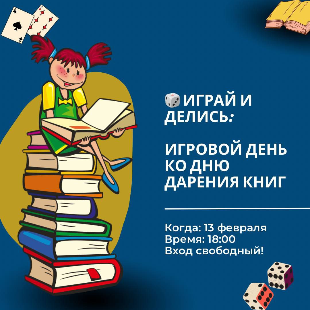 В «Русском пространстве» (РТСУ) 13 февраля в 18:00 пройдёт день интеллектуальных игр, посвященный Дню дарения книг. Организаторы решили объединить любимые настольные игры с доброй традицией — Международным днём дарения книг. Вас ждёт вечер за настольными играми, живое общение, смех и дружеская атмосфера. Также каждый может принести с собой книгу, которую готов подарить. Это может быть любимое произведение, книга, которой хочется поделиться, или просто хороший экземпляр для нового читателя.