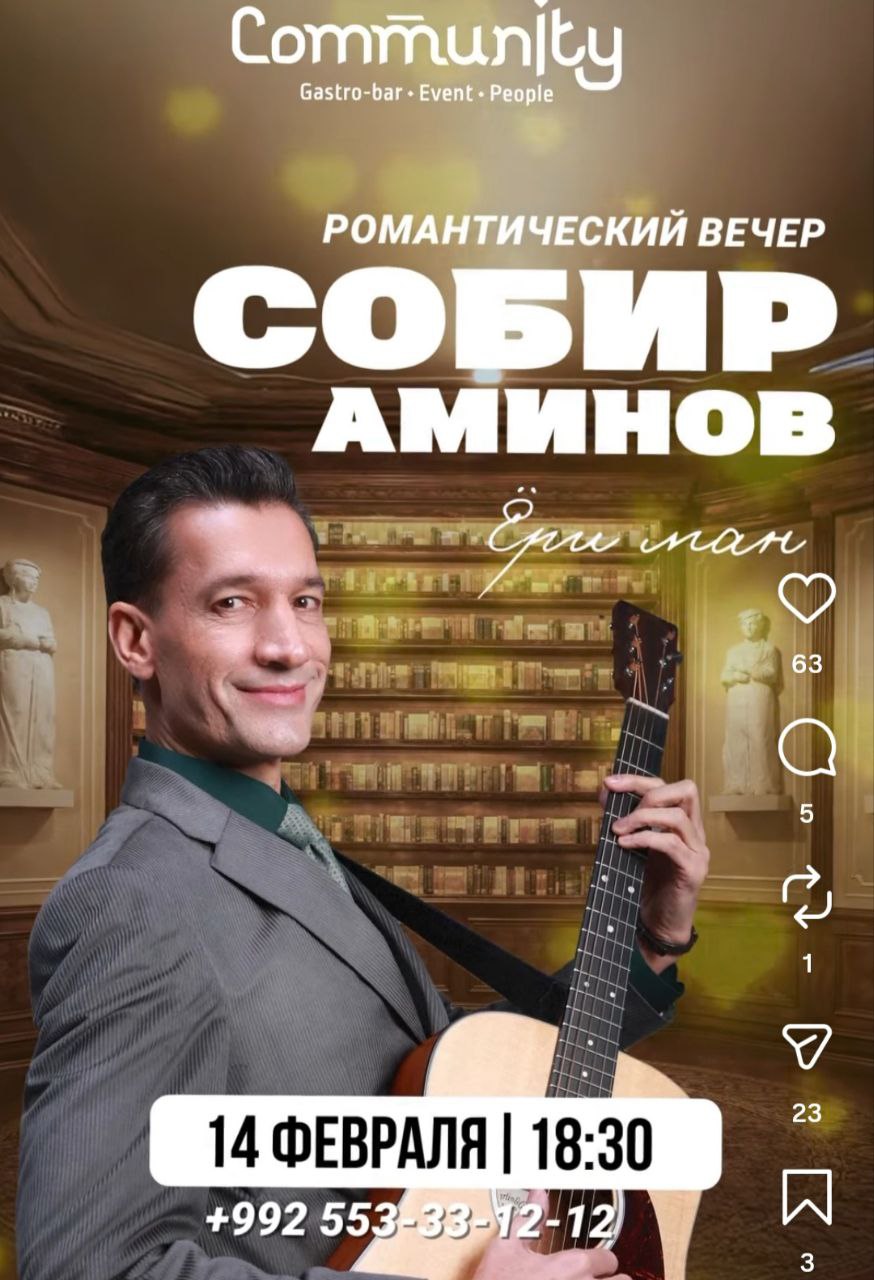 В гастробаре Community 14 февраля в 18:30 пройдет романтический вечер живой музыки «Ёри Ман», где вы сможете насладиться песнями и голосом Собира Аминова. В программе прозвучат самые известные хиты артиста о любви — самом прекрасном чувстве! Приходите парами и проведите вечер в незабываемой атмосфере.