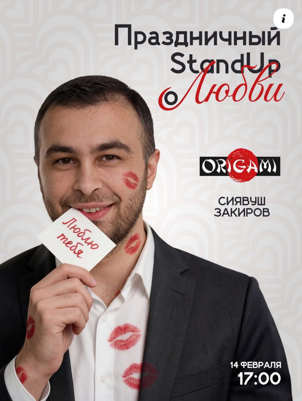 В ресторане «Оригами» 14 февраля в 17:00 состоится стендап-концерт Сиявуша Закирова «О любви». В программе: живое общение с залом, стендап и дружеская атмосфера. Однако придя сюда вы не только сможете хорошо провести время со своей второй половинкой, но и сделать доброе дело! Ведь 1/3 выручки от продажи билетов будет направлена в помощь приюту для бездомных животных «Остров надежды».