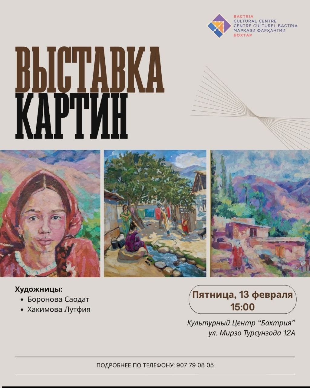 В Культурном центре «Бактрия» 13 февраля в 15:00 состоится открытие выставки-продажи работ таджикских художниц – Лутфии Хакимовой и Саодат Бороновой. Приходите, чтобы посмотреть на мир их глазами.