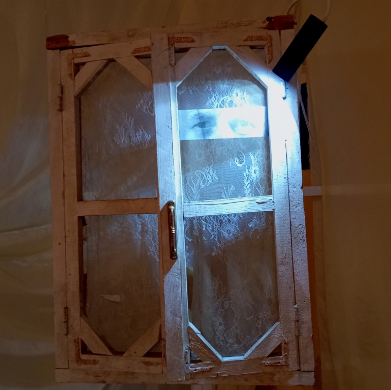 Работа Хусноро Джураевой «Окно в прошлое» — это окно, изъятое из разрушенного дома и преобразованное в символический образ памяти как портал в мир прошлого – назад в детство через дедушкин взгляд, через его привычки наблюдать за прохожими.