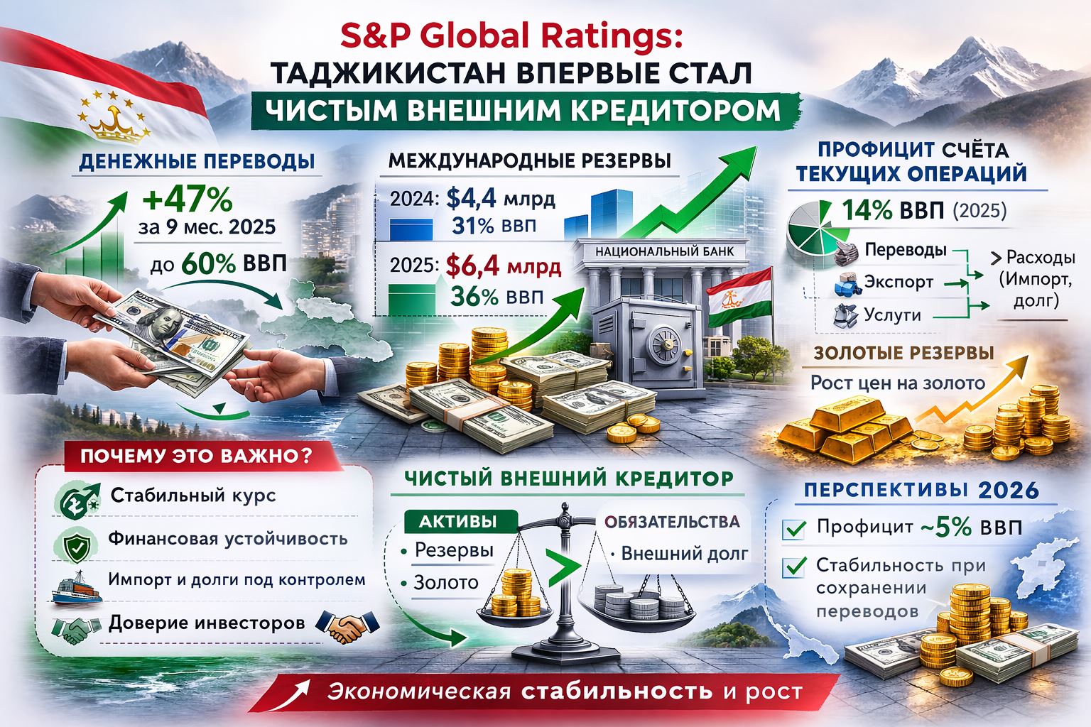 Одним из ключевых факторов укрепления резервов агентство называет резкий рост притока денежных переводов трудовых мигрантов. За первые девять месяцев 2025 года поступления увеличились на 47% в годовом выражении. В целом объём переводов достигал до 60% ВВП, что позволило стране сохранить шестой подряд профицит счёта текущих операций — около 14% ВВП в 2025 году.